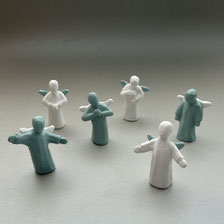 Suivant mon inspiration je modèle le santon en argile. Après cuisson, à partir de ces originaux, je fabrique les moules en silicone et plâtre. En fonction de la complexité de la pièce, le nombre de parties varie (minimum de 4 parties). Il y a un certain nombre de contre-dépouilles qui ne permettent pas la fabrication d'un moule en plâtre seul. Le tirage est fait en coulée de plâtre céramique qui donne un aspect très blanc au séchage. La résistance de ce matériau, composé de matières minérales, est proche de la céramique. Je reprend chaque pièce après tirage, de très légères différences existent entre chaque santon, chaque pièce est alors unique et entièrement fabriquée par mes mains.